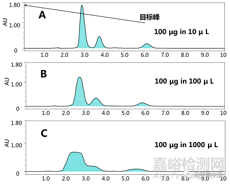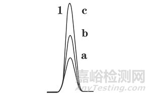 在小體積進樣時,如果質(zhì)量未超載,隨著樣品量的增加(a<b<c),譜峰面積相應(yīng)增加(aa<ab<ac),但是峰寬并沒有隨之增加,譜峰也顯正常。