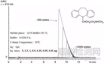 從圖2可以看出,隨著進樣質(zhì)量不斷增加,譜峰峰寬不斷增加,最終變成了直角三角形的形狀,同時譜峰的理論塔板數(shù)也不斷降低。通常,對于內(nèi)徑為4.6mm的色譜柱,其載樣量<50μg。如果是做方法轉(zhuǎn)移到其他色譜柱上,則需要調(diào)整進樣量,防止出現(xiàn)過載。