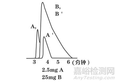 例如圖3中,A’,B’為AB組分單獨進樣時的保留分離情況。A,B為混合進樣時的保留分離情況。過載的B不管是單獨進樣還是混合進樣,均保持穩(wěn)定,而A由于過量B的存在,在混合進樣時,保留時間提前。