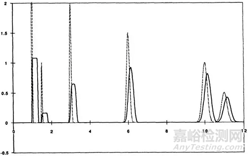 如果其中一個組分過載,表現(xiàn)出一個拖尾的色譜峰,另一組分雖未過載,但由于上述原因,也會表現(xiàn)為和過載組分形狀一致大小不同的過載峰。因此易解離組分的峰型由過載的那一種存在方式?jīng)Q定。