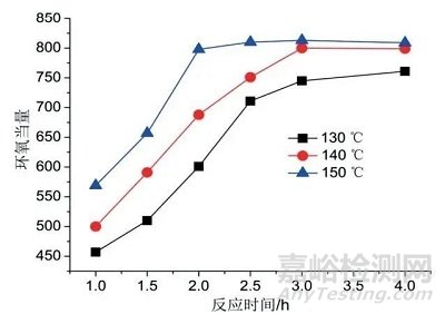 分散樹脂的合成條件如圖1所示,從圖1可知,反應溫度為130 ℃時,經過4 h的反應,分散樹脂的環(huán)氧當量難以達到理論值800 g/mol。反應溫度為140℃,經過3 h的反應,分散樹脂的環(huán)氧當量達到理論值,反應完全。當反應溫度提高至150 ℃,經過2.5 h的反應時間,分散樹脂的環(huán)氧當量達標。不同反應溫度下,反應初期反應速率較快,主要由于反應物濃度高,分子間的有效碰撞頻率高,到反應后期,體系黏度增大,反應物濃度低,限制了相對分子質量之間的碰撞,反應速率明顯下降。但從實際應用角度考慮,反應溫度越高或反應時間越長,副反應產物越多,可能導致分散樹脂分子鏈之間的交聯(lián),反應黏度增大等問題。因此,分散樹脂合成條件選擇140 ℃保溫反應3h。