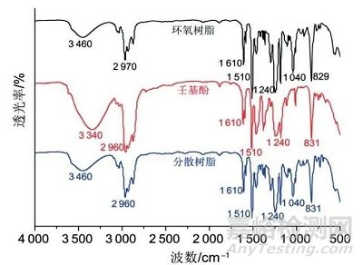 圖2 環(huán)氧樹脂、壬基酚及分散樹脂紅外光譜圖