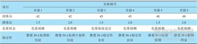 表3 固體分和顏基比對色漿狀態(tài)和穩(wěn)定性的影響