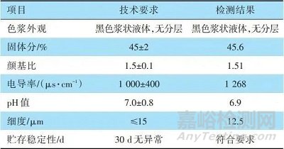 色漿的性能測試結果如表4所示,從表4可以看出,色漿外觀呈黑色漿狀液體,無分層。色漿固體分為45.6%、顏基比1.51、電導率為1268 μs/cm、pH為6.9、細度為12.5 μm、30 d貯存狀態(tài)穩(wěn)定。色漿綜合性能達到行業(yè)使用技術要求。