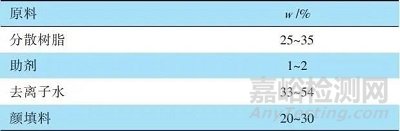 將分散樹脂加入干凈的研磨罐中,加入一定量的研磨助劑,攪拌均勻后少量多次加入去離子水,攪拌均勻并逐步加入顏填料,充分分散潤濕后,加入同體積量的研磨鋯珠。采用研磨機研磨至細度≤15 μm,加入適量去離子水調節(jié)電泳色漿固體分,過濾出料備用。采用細度刮板按GB/T 1724—1979對色漿細度進行測定,色漿細度≤15 μm;色漿固體分按照GB/T 1725—2007測定;色漿pH值及電導率采用PC510型pH計電導率儀進行測試。