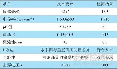 在潔凈的電泳槽中,加入電泳專用乳液、去離子水、色漿(質量比為5:6:1)配成工作液,工作液性能測試結果如表5所示。從表5可以看出,工作液的固體分為18.5%、電導率1716 μs/cm、pH值為6.2、顏基比為0.15、沉淀性為0.5 mm,L效應和再溶性合格,擊穿電壓達到380V,符合電泳涂裝工作液使用技術要求。