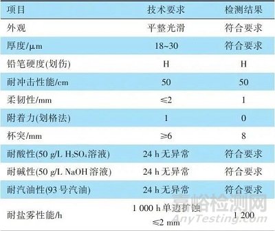 使用上述工作液在馬口鐵板和標準磷化板表面電泳涂裝,涂裝完成后將板至于室溫晾干水分,置于150~160 ℃烘箱烘烤30 min,漆膜性能測試結果如表6所示,漆膜外觀平整光滑、鉛筆硬度為H、耐沖擊性能50 cm、柔韌性為達到1 mm、杯突達到8 mm、耐酸堿及耐汽油性能達標、耐中性鹽霧性能達到1200 h,漆膜綜合性能優(yōu)良。