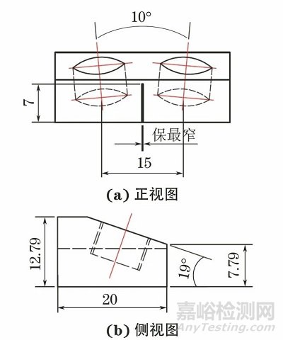楔塊采用有機玻璃制作,結(jié)構(gòu)型式為兩探頭并列式,其結(jié)構(gòu)示意如圖4所示。