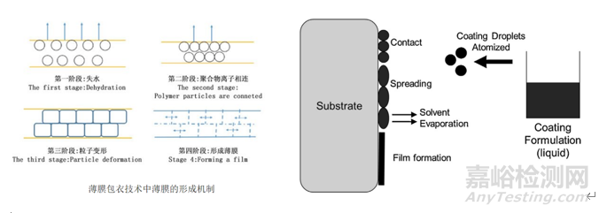 薄膜包衣技術(shù)的原理即將包衣溶液或混懸液以噴霧的方式噴射到片芯的表面,通過接觸、鋪展、液滴間的相互聚結(jié)作用而在片芯表面形成的一層衣膜。如果以成膜材料是否在介質(zhì)中溶解為依據(jù),包衣材料可以分為溶液型和分散型,溶液型包衣液是通過霧化、接觸片面并鋪展、溶劑蒸發(fā)、聚合物鏈相互滲透,經(jīng)歷凝膠狀態(tài),然后進(jìn)一步干燥形成薄膜;而分散型(霧滴內(nèi)成膜材料是混懸狀態(tài))即通過霧化、接觸片面并鋪展、溶劑蒸發(fā)、互不連接的獨(dú)立分子進(jìn)一步加熱(超過最低成膜溫度)、軟化、流動,相互連接成膜。