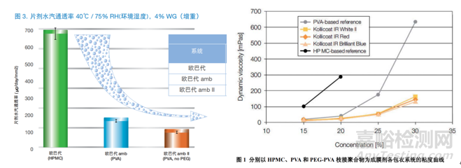 成膜材料除HPMC最為常用外,PVA(聚乙烯醇)也逐步發(fā)展為新一代的成膜劑。PVA于HPMC相比,它具有顯著的優(yōu)勢,如分子量小(溶液粘度更低,固含量更高,包衣更高效)、氫鍵結(jié)合部位更多(膜抗張強(qiáng)度更大,片芯附著力更強(qiáng),膜更致密,隔濕隔氧性更強(qiáng))、分子排列(膜柔韌性更高,膜表面更清晰,更適用于刻字片)等。但是它也有一些缺點(diǎn),比如因其氫鍵結(jié)合部位更多,形成的包衣膜更為致密,有一定鎖水能力,帶來的另一問題可能是更易粘片,因此需要更高的片床溫度(40℃以上)。為進(jìn)一步提高包衣效率,又逐漸產(chǎn)生了兩種或多種聚合物的共用,以及進(jìn)一步升級,比如PVA-PEG的聚合物(Kollicoat® IR系列),它擁有很低的成膜溫度,因而操作溫度范圍會更寬。