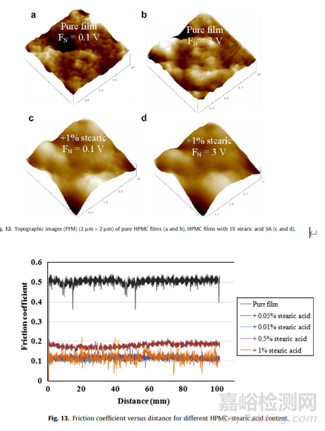 包衣配方中會加入一定量的抗粘劑以降低成膜過程中的粘片風(fēng)險(xiǎn);其特點(diǎn)是:疏水性、粒度會影響膜的粗糙度。且在成膜溶液中添加這些疏水材料可以改善水蒸氣阻隔性能。處方中常用的抗粘劑有滑石粉、微粉硅膠、硬脂酸等。例如有文獻(xiàn)研究了在HPMC為基礎(chǔ)的包衣配方中加入硬脂酸。硬脂酸摻入HPMC膜后,膜的表面結(jié)構(gòu)、疏水/親水性、粘附和摩擦特性發(fā)生了明顯變化。由于硬脂酸高含量的長鏈脂肪醇和烷烴引起的高疏水性,導(dǎo)致膜的親水性和水分轉(zhuǎn)移降低。研究結(jié)果表明脂肪酸作為疏水添加劑摻入HPMC膜中,可以降低膜的表面自由能,且平均膜粗糙度隨硬脂酸含量的增加而降低。