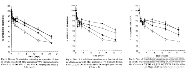 例如有文獻(xiàn)以硝苯地平用作模型藥物(因?yàn)樗哂袠O強(qiáng)的光敏性,暴露在日光和紫外線下可降解為許多光分解產(chǎn)物),研究了包衣配方中含有不同濃度的二氧化鈦對藥物穩(wěn)定性的影響,結(jié)果表明提高二氧化鈦的濃度至29.5%的水平,可以顯著降低硝苯地平藥物的光降解水平。但是著色劑的濃度也不是越高越好,通常該濃度被限制在約30%的水平,因?yàn)闈舛忍邥诒∧ぐ逻^程中損害膜的形成。