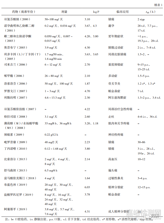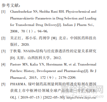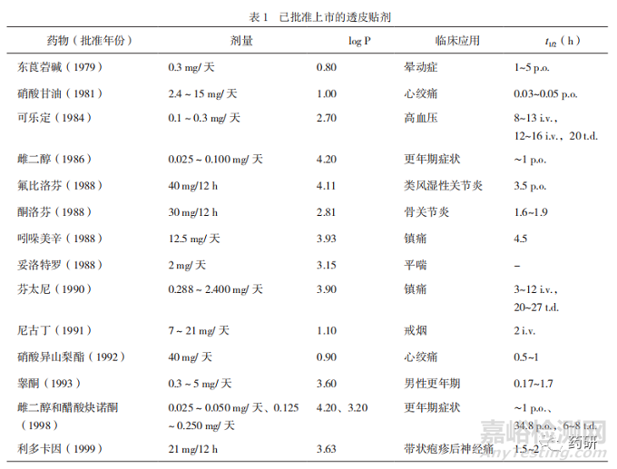 我國(guó)是最早將藥草涂抹在皮膚上,采用局部給藥方法治療傷口疼痛、感染等疾病的國(guó)家。貼敷技術(shù)最早記載于東漢時(shí)期的《五十二病方》,“以薊印其中顛”,即被毒蛇咬后,可以將新鮮的薊搗碎后壓敷在傷口的中部。到了清代,醫(yī)家吳師機(jī)發(fā)表了中國(guó)最早的外治專(zhuān)著《理瀹駢文》,其中提出了內(nèi)病外治的理論。盡管如此,一段時(shí)期以來(lái),人們對(duì)透皮給藥依舊保持著半信半疑的態(tài)度,直到20世紀(jì)70、80年代,大量透皮理論和實(shí)踐研究興起,人們才開(kāi)始逐步深刻認(rèn)識(shí)到透皮給藥技術(shù)。伴隨現(xiàn)代科技的發(fā)展,一些新型材料被應(yīng)用于透皮給藥領(lǐng)域,采用聚丙烯酸酯等壓敏膠制備的透皮貼劑,具有低致敏性、皮膚追隨和輕薄的特征?;瘜W(xué)促滲劑的使用,使更多藥物被開(kāi)發(fā)成透皮貼劑。目前在透皮給藥制劑的研發(fā)過(guò)程中著重考慮了藥物的劑量與濃度、半衰期(t1/2)、分子量(Mr)、熔點(diǎn)、溶解度(S)、pH、油水分配系數(shù)(log P)、解離常數(shù)(pKa)、分子體積、皮膚通透性、刺激致敏性、口服生物利用(F)和治療指數(shù)(TherapeuticIndex,TI)[1-2]等。此外,有學(xué)者指出藥物的色譜保留值、量化參數(shù)、分子鏈接指數(shù)、與化合物形成氫鍵的能力等均與藥物的經(jīng)皮滲透系數(shù)有很好的相關(guān)性[3]。透皮給藥技術(shù)進(jìn)入了新的時(shí)代,近年來(lái)透皮貼劑的一些重要成果[4-6]見(jiàn)表1?,F(xiàn)將劑型技術(shù)研究進(jìn)展與質(zhì)量控制要求做簡(jiǎn)要概述。