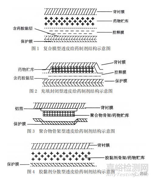 透皮貼劑根據(jù)結(jié)構(gòu)組成可分為膜控型和骨架擴(kuò)散型。①膜控型透皮貼劑的藥物和滲透促進(jìn)劑被包裹在控釋膜或者其他控釋材料形成的儲(chǔ)庫(kù)中,由控釋膜或控釋材料控制藥物的釋放。膜控型按結(jié)構(gòu)還可以分為復(fù)合型(圖1)和充填封閉型(圖2)。復(fù)合型透皮貼劑的藥物儲(chǔ)庫(kù)由含藥的壓敏膠或聚合物膜構(gòu)成,其控釋膜常為聚丙烯微孔膜;充填封閉型透皮貼劑的藥物分散于液體或軟膏、凝膠等半固體中,控釋膜為乙烯-醋酸乙烯共聚物膜等均質(zhì)膜。②骨架擴(kuò)散型透皮貼劑由骨架控制藥物的釋放,一種為聚合物骨架型(圖3),即藥物均勻分散在骨架中,再粘貼于背襯層后,將壓敏膠涂在骨架周?chē)?;另一種為膠黏劑分散型(圖4),即藥物分散在膠黏劑中,并直接鋪于背襯層上。聚合物骨架型透皮貼劑常用親水性聚合物作為骨架,如多糖、聚乙烯醇、聚乙烯吡咯烷酮、聚丙烯酸酯和聚丙烯酰胺等。