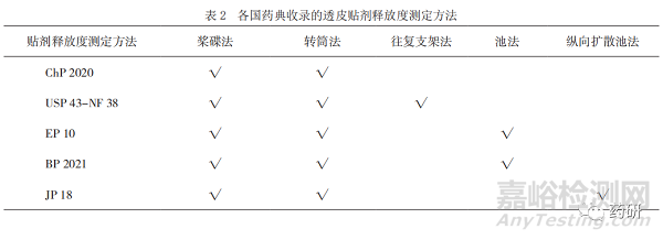 體外藥物釋放度是指活性藥物在體外規(guī)定條件下,從透皮貼劑中釋放的速度和程度。體外釋放試驗(yàn)(In Vitro Release Test,IVRT)通常用來(lái)評(píng)估透皮貼劑的藥物釋放度,是貼劑質(zhì)量研究及穩(wěn)定性考察中的重要指標(biāo)[46],同時(shí)也反映了透皮貼劑制造工藝的穩(wěn)定性[47]。各國(guó)藥典收錄的透皮貼劑釋放度測(cè)定方法的種類(lèi)如表2所示[48-51]。ChP 2020收載了適用于透皮貼劑的釋放度測(cè)定法有:槳碟法、轉(zhuǎn)筒法,并作出了限度規(guī)定。美國(guó)藥典43-國(guó)家處方集38(United States Pharmacopeia 43-NationalFormulary 38, USP 43-NF 38)對(duì)不同透皮貼劑的藥物釋放度測(cè)定方法有不同的規(guī)定,尼古丁透皮貼劑有4種,可樂(lè)定透皮貼劑有3種,而羅替戈汀透皮貼劑僅1種[52]。歐洲藥典10(European Pharmacopoeia10, EP 10)以及2021年版英國(guó)藥典(BritishPharmacopeia 2021, BP 2021)收載的透皮貼劑采用“2.9.4”溶出度檢測(cè)法來(lái)檢測(cè)釋放度?!度毡舅幘址健肥蛰d的透皮貼劑的藥物釋放度則根據(jù)批準(zhǔn)時(shí)的方法進(jìn)行檢測(cè)[44]。