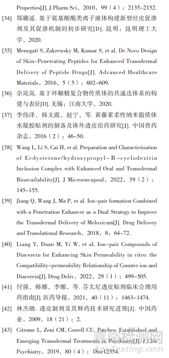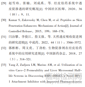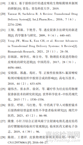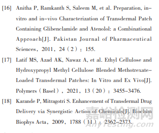 藥物需要透過(guò)皮膚的各層次,才能被吸收進(jìn)入人體血液循環(huán)。但皮膚的屏障作用會(huì)影響藥物透過(guò)皮膚的量,限制大多數(shù)藥物的有效吸收。為了促進(jìn)貼劑中藥物的透皮吸收,目前主要采用物理促滲、化學(xué)促滲、生物促滲、藥劑學(xué)促滲以及促滲技術(shù)聯(lián)用等方式。①物理促滲技術(shù)是借助機(jī)械裝置產(chǎn)生的物理作用,減少藥物透過(guò)皮膚屏障的阻力或增大動(dòng)力,主要包括[22-25]:離子導(dǎo)入法、電致孔法、超聲波促滲法、微針裝置、熱致孔技術(shù)、光機(jī)械波法、磁場(chǎng)導(dǎo)入法、駐極體以及獨(dú)具中醫(yī)特色的罐療。張佳等[26]將中藥方制成膏劑,通過(guò)離子導(dǎo)入技術(shù)對(duì)腹腔鏡術(shù)后濕熱瘀結(jié)型盆腔炎性不孕患者進(jìn)行治療,結(jié)果表明,中藥離子導(dǎo)入技術(shù)可以縮短病程、提高妊娠率。隆豫[27]將小針刀結(jié)合正清風(fēng)痛寧注射液電致孔透皮給藥治療腰腿痛,隨訪16個(gè)月,觀察組臨床治療總有效率更高。在上市藥品里,通用醫(yī)藥公司開(kāi)發(fā)的Lectro貼片以及美國(guó)Alza公司開(kāi)發(fā)的E-TRANS貼片均采用離子導(dǎo)入法增加藥物的經(jīng)皮滲透率。此外,物理促滲劑,如海綿骨針及其溶液也可增加藥物及活性成分的經(jīng)皮吸收[28]。②化學(xué)促滲技術(shù)主要采用化學(xué)促滲劑影響皮膚角質(zhì)層的液化、破壞角質(zhì)層的脂質(zhì)雙分子層或增加流動(dòng)性,來(lái)增強(qiáng)皮膚滲透性。化學(xué)促滲劑可分為化學(xué)合成類(lèi)和天然類(lèi)[29],化學(xué)合成類(lèi)[30]主要有:亞砜類(lèi)、氮酮類(lèi)、醇類(lèi)、萜(烯)類(lèi)、脂肪酸及其衍生物(酯、胺)、表面活性劑等,天然類(lèi)[31]主要有:揮發(fā)油類(lèi)、生物堿類(lèi)、蒽醌類(lèi)、皂苷類(lèi)等。現(xiàn)多同時(shí)使用2種以上的促滲劑,一方面可以減少促滲劑的用量,另一方面聯(lián)合使用可以產(chǎn)生更有效的透皮吸收。③生物促滲技術(shù)采用生物促滲劑增加藥物的經(jīng)皮吸收,其相對(duì)于化學(xué)促滲劑,生物相容性良好、毒性低,對(duì)藥物具有選擇性,能特異性地作用于角質(zhì)層的某一位點(diǎn)[32]。生物促滲劑有促滲肽、代謝調(diào)節(jié)劑、氨基酸衍生物和神經(jīng)酰胺及其類(lèi)似物。主要作用于毛囊、汗腺、角質(zhì)層和活性表皮[32]。Li等[33]用三維培養(yǎng)的人表皮進(jìn)行體外透皮滲透試驗(yàn),表明胰蛋白酶可以通過(guò)細(xì)胞間途徑和毛囊途徑增加胰島素的經(jīng)皮滲透。鄭璐遙[34]設(shè)計(jì)合成了新型氨基酸酯類(lèi)離子液體,并通過(guò)ATR-FTIR和固體NMR實(shí)驗(yàn)證明了L-脯氨酸十二烷基酯鹽酸鹽和L-亮氨酸十二烷基酯鹽酸鹽這2種氨基酸脂類(lèi)離子液體能使角質(zhì)層脂的脂質(zhì)流化以及使角蛋白構(gòu)象發(fā)生改變。促滲肽,如八聚體肽能使環(huán)孢素A在角質(zhì)層和表皮中的滲透性提高5倍[35]。④藥劑學(xué)促滲技術(shù)利用微乳、環(huán)糊精和納米載體(脂質(zhì)體、醇質(zhì)體、傳質(zhì)體、固體脂質(zhì)納米粒等)等載體的特殊藥劑學(xué)藥效結(jié)構(gòu),在增加藥物溶解性的同時(shí)增加皮膚通透性[36]。李偉澤等[37]研究表明,黃藤素柔性納米脂質(zhì)體水凝膠貼劑的藥物累積透過(guò)量為普通貼劑的2.12倍,具有較高的藥物透皮吸收效率。Wang等[38]指出,采用羥丙基-β-環(huán)糊精包合的蛻皮甾酮的透皮生物利用度是游離體的1.92倍。此外,離子對(duì)的應(yīng)用也大大促進(jìn)了藥物的透皮吸收,Jiang等[39]以乙二胺(Ethylene Diamine Tetraacetic Acid,EDTA)作為反離子,制備了含有乙二胺-美洛昔康離子對(duì)的透皮貼劑,結(jié)果表明,該離子對(duì)的形成能促進(jìn)美洛昔康的皮膚滲透,增加藥物累積量。Liang等[40]通過(guò)觀察雙細(xì)胞素與不同反離子形成的離子對(duì)化合物的體外皮膚滲透性,發(fā)現(xiàn)雙細(xì)胞素離子對(duì)化合物的體外滲透通量會(huì)隨著二者相容性的增加而增加。