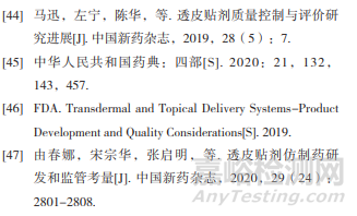 2020年版《中華人民共和國(guó)藥典》(ChinaPharmacopeia 2020, ChP 2020)四部收載的0121貼劑檢測(cè)項(xiàng)目包括:含量均勻度、重量差異、黏附力、微生物限度、釋放度等[45]。由于透皮貼劑是較新的劑型,不同企業(yè)具有不同的處方工藝,其質(zhì)量控制方法差異較大,但通常都會(huì)對(duì)貼劑的性狀、鑒別和含量進(jìn)行規(guī)定,且會(huì)對(duì)產(chǎn)品的關(guān)鍵質(zhì)量屬性進(jìn)行重點(diǎn)研究,以下為總結(jié)的透皮貼劑的關(guān)鍵質(zhì)量屬性。