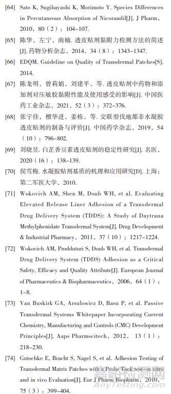 黏附力反映了透皮貼劑與皮膚黏附的牢固程度。藥物釋放的程度及速度與貼劑和皮膚接觸的面積、緊密程度和持續(xù)時(shí)間是直接相關(guān)的,越來(lái)越多的業(yè)內(nèi)人士認(rèn)識(shí)到,黏附力也是直接影響透皮貼劑的安全性和有效性的一項(xiàng)重要的質(zhì)控指標(biāo)[65]。ChP 2020四部中收載了黏附力測(cè)定法,分別為:初黏力、持黏力、剝離強(qiáng)度及黏著力[45]。初黏力是指貼劑黏性表面與皮膚在輕微壓力接觸時(shí)對(duì)皮膚的黏附力;持黏力可反映貼劑的膏體抵抗持久性外力所引起變形或斷裂的能力;剝離強(qiáng)度表示貼劑的膏體與皮膚的剝離抵抗力;黏著力表示貼劑的黏性表面與皮膚附著后對(duì)皮膚產(chǎn)生的黏附力。①初黏力的檢測(cè)方法主要為滾球法和探針?lè)?,滾球法又可分為滾球平面停止法和滾球斜面停止法,通過(guò)將適宜的鋼球分別滾置于傾斜板或平面板上的貼劑黏性面,根據(jù)能粘住的最大球號(hào)鋼球,評(píng)價(jià)初黏力的大小。探針?lè)ㄊ且砸欢ǖ膶?shí)驗(yàn)條件,用探針輕觸貼劑的黏性面,使用傳感器定量測(cè)量其分離時(shí)所需要的力。②持黏力在測(cè)量時(shí)將貼劑黏性面粘貼于試驗(yàn)板表面,垂直放置,并沿貼劑的長(zhǎng)度方向施加拉力。測(cè)量持黏力的方法可分為靜態(tài)法和動(dòng)態(tài)法,靜態(tài)法是測(cè)定在固定拉力下將貼劑拉離所需的時(shí)間或固定時(shí)間內(nèi)貼劑的位移量;動(dòng)態(tài)法是測(cè)定將貼劑拉離的拉力。③剝離強(qiáng)度在測(cè)定時(shí)將貼劑的背襯面粘于金屬板上,揭去防粘層,覆上聚酯薄膜后,再以一定的角度(180°、90°兩種)剝離,由自動(dòng)記錄儀繪岀剝離曲線。④黏著力在測(cè)定時(shí)將貼劑黏附面朝上置于上樣模塊上,將兩邊的蓋襯分別撕開(kāi)少許,再用壓條分別壓住,除去蓋襯后放置在夾具底板上,將壓板水平壓下使貼劑黏性面均勻繃緊,最后選擇合適的測(cè)定模式進(jìn)行測(cè)定。
