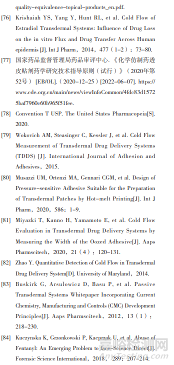 國(guó)家藥品監(jiān)督管理局藥品審評(píng)中心在《化學(xué)仿制藥透皮貼劑藥學(xué)研究技術(shù)指導(dǎo)原則(試行)》中提出了對(duì)貼劑的冷流情況進(jìn)行考察[77],并指出在仿制藥的開(kāi)發(fā)過(guò)程中應(yīng)重視處方的流變學(xué)研究。歐洲藥品管理局在《透皮貼劑質(zhì)量指南》中要求企業(yè)應(yīng)提供產(chǎn)品的冷流檢測(cè)項(xiàng)目的數(shù)據(jù)[66]。美國(guó)藥典通則表明冷流應(yīng)通過(guò)合適的方法進(jìn)行定性和定量測(cè)量[78],對(duì)于上市的透皮貼劑,檢測(cè)冷流的方式包括用于計(jì)算冷流量的擦拭法、宏觀評(píng)級(jí)法、顯微鏡評(píng)價(jià)法和持黏力測(cè)定法[79]。①擦拭法可用于定量測(cè)定冷流量,能通過(guò)計(jì)算估計(jì)貼劑中藥物的損失量,但測(cè)得的冷流量取決于計(jì)算方法,且無(wú)法評(píng)價(jià)使用過(guò)程帶來(lái)的困難性;②宏觀評(píng)級(jí)法將透皮貼劑與包裝袋、防黏層之間的黏附性分為4個(gè)等級(jí),同時(shí)把冷流是否可見(jiàn)于透皮貼劑的角或邊的程度也分為4個(gè)等級(jí),最后將3個(gè)方面得到的等級(jí)取平均值進(jìn)行最終判定,該種評(píng)價(jià)方法能反映使用過(guò)程中的難易程度,但其產(chǎn)生的黏性不取決于冷流量;③顯微鏡評(píng)價(jià)法借助于放大技術(shù)測(cè)量透皮貼劑邊緣以外的冷流距離,該方法能準(zhǔn)確觀察到冷流分布的范圍,但也可能會(huì)因?yàn)槔淞鞑糠值男螤疃o出不準(zhǔn)確的評(píng)分(如0.31 mm長(zhǎng)的柱狀冷流與0.30 mm直徑的環(huán)狀冷流),且未包含到殘留在袋子或防黏層上的冷流;④持黏力測(cè)定法能反應(yīng)貼劑的內(nèi)聚力,但該方法不是預(yù)測(cè)冷流的合適指標(biāo),且需要持續(xù)24小時(shí),較耗時(shí)。目前國(guó)內(nèi)外藥典均尚無(wú)檢測(cè)貼劑冷流現(xiàn)象的技術(shù)手段及評(píng)價(jià)指標(biāo),但已有相應(yīng)研究進(jìn)行,如Umberto等[80]通過(guò)肉眼觀察透皮貼劑的背襯層邊緣是否有壓敏膠的出現(xiàn)來(lái)判斷基質(zhì)的冷流現(xiàn)象。Miyazaki等[81]通過(guò)測(cè)量滲出粘合劑的寬度來(lái)評(píng)估透皮給藥系統(tǒng)中的冷流。Zhao等[82]用剪切黏附(或蠕變?nèi)崃浚⒔t外光譜技術(shù)建立模型來(lái)評(píng)價(jià)貼劑的冷流現(xiàn)象。