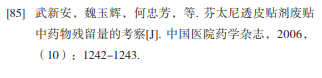 透皮貼劑中藥物的含量通常高于使用過(guò)程中的遞送劑量,以達(dá)到臨床有效給藥率。藥物殘留是指透皮貼劑在使用結(jié)束后,貼劑中仍含有的藥物量。殘留的藥物對(duì)患者、他人和環(huán)境都存在風(fēng)險(xiǎn)[77]。目前市場(chǎng)上銷(xiāo)售的透皮貼劑在預(yù)期使用期后可能殘留初始藥物總量的10%~95%[83],使用后殘留的藥物會(huì)帶來(lái)一定的安全隱患,特別是芬太尼等具有一定成癮性的藥物,貼劑產(chǎn)品中的過(guò)量殘留藥物增加了藥物濫用的可能性,因此有必要對(duì)使用后貼片上的殘留藥物量進(jìn)行分析[84]?!痘瘜W(xué)仿制藥透皮貼劑藥學(xué)研究技術(shù)指導(dǎo)原則(試行)》中指出,應(yīng)對(duì)透皮貼劑的藥物殘留特性進(jìn)行研究,并在臨床階段對(duì)殘留量進(jìn)行實(shí)際研究,而不應(yīng)僅根據(jù)理論計(jì)算或文獻(xiàn)數(shù)據(jù)評(píng)估。仿制藥的藥物殘留量不應(yīng)超過(guò)參比制劑,否則應(yīng)對(duì)其合理性進(jìn)行說(shuō)明[77]。武新安等[85]用乙腈對(duì)使用了3天的芬太尼透皮貼劑殘貼中的芬太尼進(jìn)行提取,通過(guò)高效液相色譜法測(cè)得廢貼平均殘留量為35.56%。
