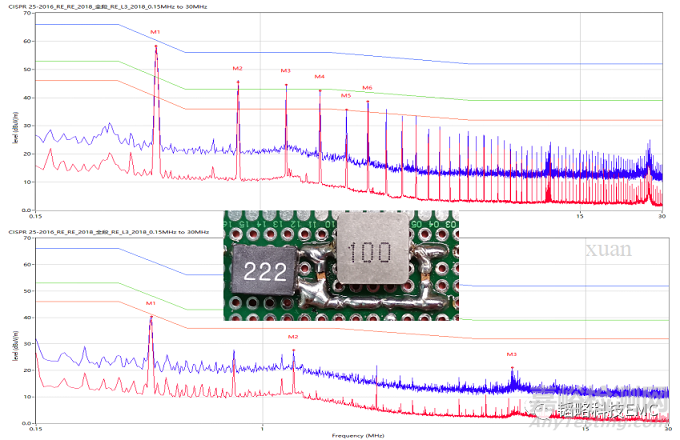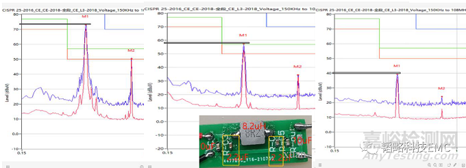 這是某個車載客戶在測試VCE的時候,發(fā)現(xiàn)BUCK電路的400KHz頻率超標(biāo),由于客戶板內(nèi)PCB沒有差模濾波電路,所以飛了一個DEMO板來測試,最左側(cè)數(shù)據(jù)是沒有加措施的在75dB的位置;中間數(shù)據(jù)是加了一個8.2uH電感、左右各并一個2.2uF電容的測試數(shù)據(jù),在58dB的位置;最右側(cè)的數(shù)據(jù)是在上一個措施上再在左右兩側(cè)彌補(bǔ)一個10uF電容,在40dB的位置,測試得出的效果!
