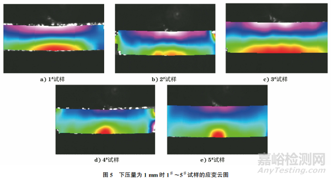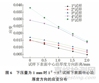 DIC測量下壓量為1mm時1#~5# 試樣的應(yīng)變云圖如圖5所示,由圖5可知,應(yīng)變均集中在試樣下表面與壓輥同軸的位置,其余大部分區(qū)域的應(yīng)變都很小,1#,2#和3#試樣的應(yīng)變分布區(qū)域較大,而4#,5#缺口試樣的應(yīng)變主要集中在缺口附近。1#~5#試樣下表面中心沿厚度方向的應(yīng)變分布如圖6所示,由圖6可知:1#,2#和3#試樣的應(yīng)變分布比較接近,表明表面狀態(tài)對試樣應(yīng)力、應(yīng)變分布的影響較??;在彈性階段,1#,2#和3#試樣并無明顯差別,4#,5#試樣的應(yīng)變明顯大于1#,2#和3#試樣,并且下降的趨勢更明顯,表明缺口處承受了更大的載荷,離缺口越近,應(yīng)力集中現(xiàn)象越明顯。