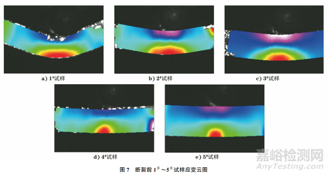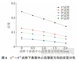 圖7為斷裂前1#~5#試樣的應(yīng)變云圖,1#試樣破壞時的應(yīng)變最大,彎曲撓度也最大,塑性最好,隨著表面缺口處應(yīng)力集中的增加,彎曲撓度逐漸減小,試樣破壞時的應(yīng)變更加集中,試樣下表面中心沿厚度方向的應(yīng)變分布如圖8所示,隨著表面質(zhì)量的下降及缺口尺寸的增加,試樣的塑性變形區(qū)也減小。隨著缺口深度的增加,試樣的破壞應(yīng)變進一步減小,但4#和5#試樣較為接近,這說明當缺口未達到斷裂閾值時,仍可通過塑性變形把應(yīng)力集中在一定區(qū)域內(nèi)并釋放。3#試樣的應(yīng)變區(qū)域相較于4#,5#試樣更大,說明該種類型的缺口雖造成了應(yīng)力集中,但束縛相對較小,加載過程中能夠用更大的塑性變形區(qū)域緩解局部應(yīng)力集中,從而延遲斷裂。通過斷裂前的應(yīng)變分布可以發(fā)現(xiàn),隨著應(yīng)力集中系數(shù)的增大,應(yīng)變集中區(qū)域的面積顯著減小,這是因為鈦合金應(yīng)變強化能力較弱,缺口產(chǎn)生應(yīng)力集中時,應(yīng)變強化影響的范圍小,塑性變形集中,導(dǎo)致鈦合金對缺口更為敏感。