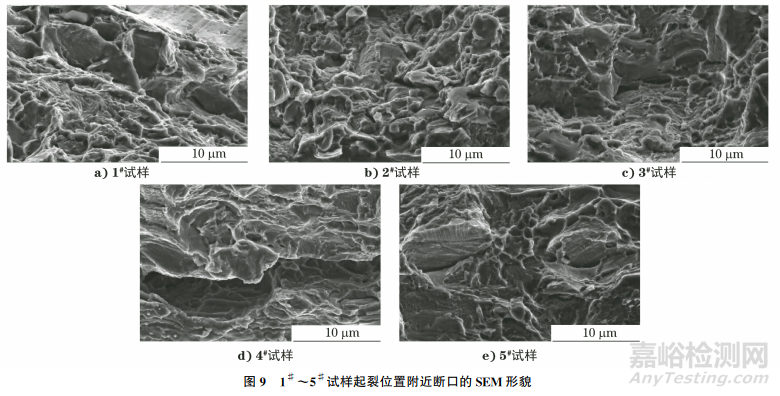 圖9為1#~5#試樣起裂位置附近斷口的SEM形貌,試樣斷口特征主要為韌窩,在3#,4#,5#試樣中觀察到二次裂紋。不同表面狀態(tài)試樣的斷裂形式均為微孔聚集斷裂,表明雖然引入了缺口,存在應(yīng)力集中,但缺口處仍然發(fā)生塑性變形,表現(xiàn)為延性斷裂。