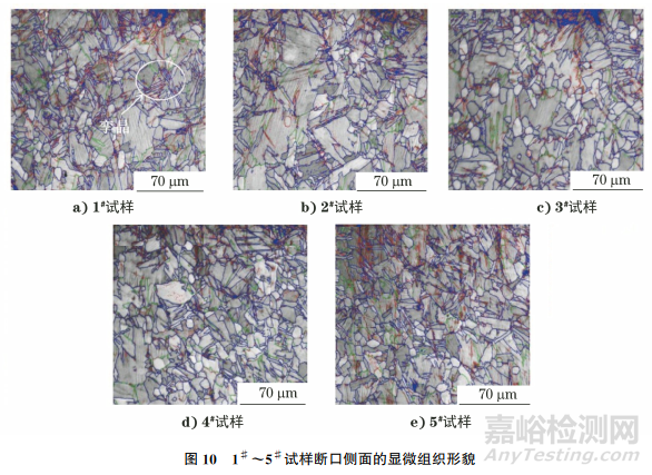 圖10為1#~5#試樣斷口側(cè)面的顯微組織形貌,晶粒經(jīng)歷過變形,產(chǎn)生一些碎化,1#,2#和3#試樣碎化較輕微,4#和5#試樣晶粒碎化更嚴重,并且在1#試樣中觀察到一些孿晶。根據(jù)統(tǒng)計,1#~5#試樣中均存在大量的2°~5°的小角度晶界,晶界數(shù)量隨表面質(zhì)量的下降及缺口尺寸的增加呈下降趨勢,小角度晶界的數(shù)量越多,試樣變形越嚴重。