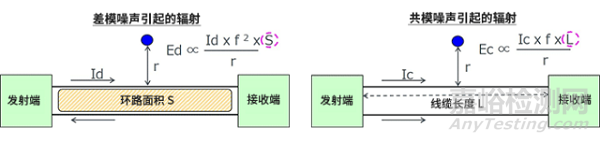 由差模噪聲引起的輻射的電場強(qiáng)度Ed可通過左下方的公式來表示。Id為差模中的噪聲電流,r為到觀測點(diǎn)的距離,f為噪聲頻率。差模噪聲會產(chǎn)生噪聲電流環(huán),因此環(huán)路面積S是非常重要的因素。如圖和公式所示,假設(shè)其他因素固定,環(huán)路面積越大則電場強(qiáng)度越高。
