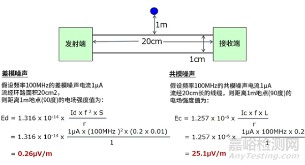 為了更好地認(rèn)識每種噪聲引發(fā)的輻射特點(diǎn),接下來代入實(shí)際數(shù)值來計算一下電場強(qiáng)度*1。條件完全相同。電場強(qiáng)度的觀測點(diǎn)用藍(lán)色圓點(diǎn)來表示。*1:公式來源-EMC工學(xué)詳解 實(shí)用降噪技法 作者Henry W.Ott-東京電機(jī)大學(xué)出版社
