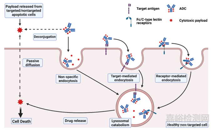圖1 ADC毒性作用機(jī)制(完整的ADC進(jìn)入正常細(xì)胞可能通過非特異性內(nèi)吞作用,或通過與靶抗原或Fc/C型凝集素受體結(jié)合而內(nèi)化。細(xì)胞外液中的ADC分子解離的有效載荷或其他靶向/非靶向凋亡細(xì)胞釋放的有效載荷可通過細(xì)胞膜被動擴(kuò)散或非特異性內(nèi)吞的方式進(jìn)入正常細(xì)胞。
