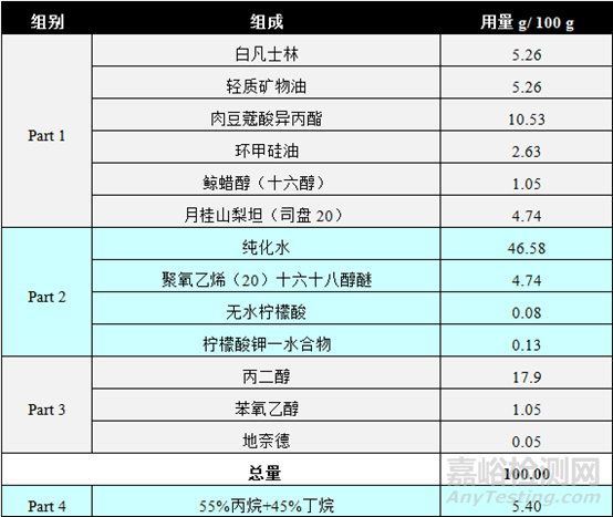 ⑦ 將包含所有組分的混合容器攪拌冷卻至25-30℃,灌裝前乳液最終溫度應(yīng)維持在20-25℃,填充Part 4所述的拋射劑。