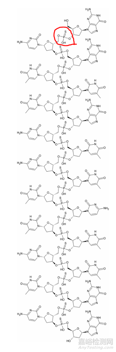圖1. Fomivirsen化學(xué)結(jié)構(gòu)(紅色部分為一個硫代磷酸酯結(jié)構(gòu)),來源:Wikipedia