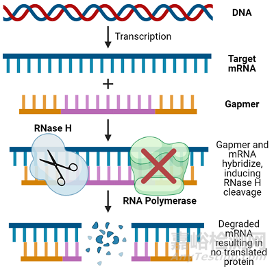 Gapmer與目標(biāo)RNA片段雜交,通過招募RNAse-H酶,通過其裂解作用來沉默該目標(biāo)基因。由于遭修飾的RNA側(cè)翼區(qū)域提高了它對核酸酶降解的抵抗力,因此,gapmer與靶標(biāo)的結(jié)合具有更高的親和力和生物活性(圖3)。Gapmer目前正在被開發(fā)用于治療多種癌癥、病毒和其他慢性遺傳性疾病。