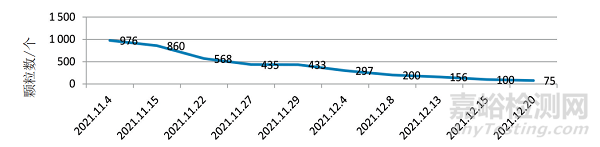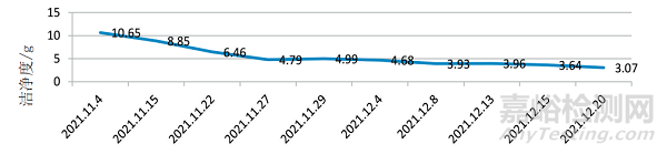 檢測分析結(jié)果顯示,由焊裝進(jìn)入涂裝車間的車身潔凈度影響因素包括焊球、油脂、涂膠溢膠、灰塵等,此類影響因素的產(chǎn)生受到人、機(jī)、料、法、環(huán)等各方面影響。陳磊、李平等人分別針對電泳漆膜缺陷類型進(jìn)行分析,結(jié)果表明:由于焊接工藝影響直接或間接導(dǎo)致的缺陷分別占比40%和81%,纖維分別占比18%和4%,考慮焊裝膠的影響,此影響因素占比高達(dá)到39%。為此,應(yīng)該重點(diǎn)關(guān)注鐵屑,焊裝膠,纖維等影響因素,嚴(yán)格控制此類影響因素能夠顯著提升車身電泳漆膜質(zhì)量。圖1和圖2匯總了某段時(shí)間兩款車型白車身潔凈度質(zhì)量和車身前蓋顆粒狀態(tài)變化趨勢,可見漆膜質(zhì)量與潔凈度正相關(guān)。結(jié)合前處理-電泳段清潔容量和電泳質(zhì)量要求,公司嚴(yán)格制定白車身潔凈度工藝標(biāo)準(zhǔn),執(zhí)行潔凈度降低計(jì)劃,白車身潔凈度管控標(biāo)準(zhǔn)調(diào)整為低于5g/臺。本研究針對不同白車身影響因素和缺陷類型進(jìn)行總結(jié)分析。