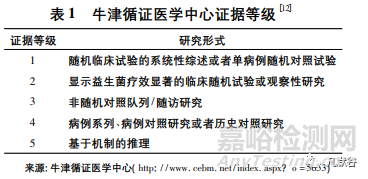 循證醫(yī)學( evidence-based medicine,EBM) 又稱實證醫(yī)學,其核心思想是醫(yī)療決策( 即患者的處理、治療指南和醫(yī)療政策的制定等) 應在現有最好的臨床研究依據基礎上作出,同時也重視結合個人的臨床經驗。傳統醫(yī)學以經驗醫(yī)學為主,即根據非實驗性的臨床經驗、臨床資料和對疾病基礎知識的理解來診治患者。循證醫(yī)學并非要取代臨床技能、臨床經驗、臨床資料和醫(yī)學專業(yè)知識,它只是強調任何醫(yī)療決策應建立在最佳科學研究證據基礎上[22]。臨床研究依據按其科學性和可靠程度大體可分為 4 ~5 級[23]。