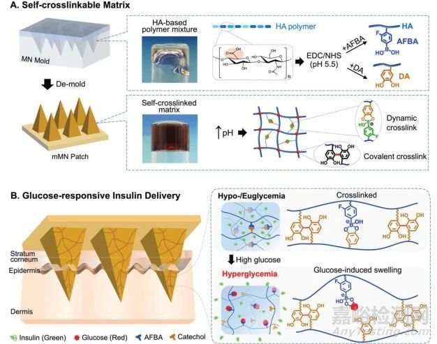 本研究利用受貽貝啟發(fā)化學(xué)的優(yōu)勢(shì),設(shè)計(jì)了一種新型自交聯(lián)聚合物基質(zhì) MN(mMN)貼片,該貼片能夠封裝高濃度胰島素,具有超強(qiáng)溶脹能力,并能在高血糖時(shí)快速輸送胰島素。mMN 陣列由透明質(zhì)酸(HA)聚合物骨架與含兒茶酚的多巴胺(DA)和 4-氨基-3-氟苯硼酸(AFBA)功能化而成,聚合物水溶液在微堿性 pH 值下混合后可快速交聯(lián)。mMN 的交聯(lián)是通過(guò) i)兒茶酚-兒茶酚(DA-DA)共價(jià)連接和 ii)兒茶酚與 AFBA 之間的動(dòng)態(tài)/可逆絡(luò)合形成的,無(wú)需額外的交聯(lián)劑和/或加熱或紫外線照射(圖 1A)。在生理和高血糖條件下,AFBA 通過(guò)與兒茶酚基團(tuán)解離而優(yōu)先與葡萄糖結(jié)合,導(dǎo)致二次交聯(lián)網(wǎng)絡(luò)斷裂,增強(qiáng)水凝膠的膨脹并促進(jìn)胰島素釋放(圖 1B)。相反,在低血糖/無(wú)血糖條件下,AFBA 可逆地與鄰苯二酚形成復(fù)合物,重新形成二次交聯(lián)網(wǎng)絡(luò),促進(jìn)水凝膠致密化,從而延緩胰島素釋放,降低低血糖風(fēng)險(xiǎn)。這種新型 mMN 貼片具有充分的皮膚滲透性、快速和超高膨脹能力、高胰島素負(fù)荷能力以及有效的低血糖/高血糖預(yù)防功能。由于其在高血糖狀態(tài)下的出色胰島素輸送特性以及保留胰島素生物活性的能力,經(jīng)體內(nèi)實(shí)驗(yàn)證實(shí),這種新型 MN 貼片在微創(chuàng)胰島素給藥方面具有巨大潛力。