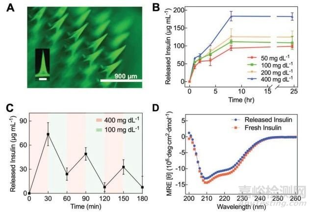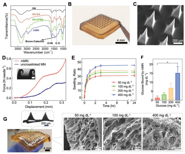 傅立葉變換紅外光譜(FTIR)用于確認(rèn) mMN 貼片交聯(lián)成功(圖 2A)。與 HA 相比,HA-DA 和 HA-AFBA 在 1591 和 1285 cm-1 處出現(xiàn)兩個(gè)峰值,分別歸因于 C═N 伸展振動(dòng)和芳香族 C─C 伸展振動(dòng),表明 DA 和 AFBA 功能基團(tuán)已成功共軛到 HA 主干上。交聯(lián)后聚合物的紅外光譜在 1480cm-1 處出現(xiàn)了一個(gè)新的峰值,這是由于形成了鄰苯二酚-硼酸酯復(fù)合物。此外,在 ≈3300-3400 cm-1 處鄰苯二酚羥基的寬帶顯著降低,表明形成了 DA-DA 共價(jià)連接。本研究還關(guān)注了不同重量比的 HA-DA 和 HA-AFBA 混合物的流變學(xué),以確定適合貼片制造的理想凝膠化動(dòng)力學(xué),同時(shí)實(shí)現(xiàn)葡萄糖反應(yīng)性。在測(cè)試的比例中,HA-DA 和 HA-AFBA 的比例為 2:1,由于凝膠化階段相對(duì)較慢,水凝膠更容易轉(zhuǎn)移到模具中,而且形成的 MN 具有更鋒利的尖端,完整性更好,因此被選中用于制造 mMN 補(bǔ)丁。如圖 2B、C 所示,mMN 補(bǔ)丁由 10×10 的微針陣列組成,長(zhǎng)度為 800 微米,呈金字塔形。補(bǔ)片呈現(xiàn)獨(dú)特的棕色是由于 DA-DA 共價(jià)交聯(lián)過(guò)程中兒茶酚基團(tuán)發(fā)生氧化所致。交聯(lián)的 mMN 貼片每針的斷裂力超過(guò) 0.45 牛頓,而未交聯(lián)的 MN 貼片每針的斷裂力為 0.27 牛頓(圖 2D),這表明在接下來(lái)的動(dòng)物實(shí)驗(yàn)中,交聯(lián)為皮膚穿透提供了足夠的機(jī)械強(qiáng)度。本研究將 mMN 貼片浸入不同葡萄糖濃度(50、100、200 或 400 毫克 dL-1)的磷酸鹽緩沖鹽水(PBS,pH 7.4)中,代表低血糖、優(yōu)血糖和高血糖條件,從而檢測(cè) mMN 陣列的溶脹能力。200 mg dL-1 的葡萄糖濃度是與糖尿病患者臨床相關(guān)的高血糖水平,而 400 mg dL-1 通常在 T1D 大鼠模型中觀察到。如圖 2E 所示,mMN 在高血糖時(shí)變得極度腫脹,在 400 mg dL-1 葡萄糖介質(zhì)中浸泡 3 小時(shí)后,腫脹程度達(dá)到其干重的 45 倍以上。值得注意的是,在最大膨脹狀態(tài)下,可膨脹 mMN 的針頭仍保持完整(圖 2G)。