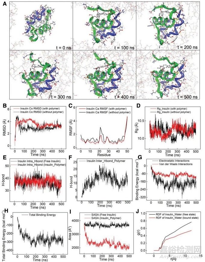 除實(shí)驗(yàn)研究外,本研究還利用分子建模和計(jì)算生物學(xué)方法研究了水凝膠聚合物對(duì)胰島素分子的穩(wěn)定作用的分子機(jī)制。利用全原子分子動(dòng)力學(xué)(MD)模擬研究了胰島素與功能化聚合物之間的相互作用模式,其中聚合物鏈與胰島素的摩爾比是根據(jù)實(shí)驗(yàn)中使用的比例確定的。圖 4A 顯示了在 HA-DA 和 HA-AFBA 聚合物存在時(shí),胰島素在 t = 0(起點(diǎn))、100、200、300、400 和 500 ns 的快照。如圖 4A 所示,聚合物鏈包圍了胰島素分子,隨著時(shí)間的推移,它們完全包裹了胰島素分子。為了解聚合物對(duì)蛋白質(zhì)結(jié)構(gòu)和穩(wěn)定性的影響,本研究分析了胰島素在沒(méi)有聚合物或有聚合物的情況下的均方根偏差(RMSD)值(圖 4B)。在這項(xiàng)研究中,多肽α碳原子(Cα)的 RMSD 值是在模擬過(guò)程中參照其初始結(jié)構(gòu)計(jì)算得出的。在模擬開(kāi)始時(shí)(t = 0 到 t < 150 ns),存在聚合物的胰島素的 RMSD 值高于其自由狀態(tài)。肽的較高流動(dòng)性可歸因于分子與聚合物殘基相互作用的初始運(yùn)動(dòng)。然而,在 150 ns 時(shí),RMSD 值下降,這是因?yàn)橐葝u素與聚合物的相互作用趨于穩(wěn)定(圖 4B)。本研究還監(jiān)測(cè)了胰島素分子中每個(gè)殘基的均方根波動(dòng)(RMSF),以確定聚合物對(duì)多肽殘基動(dòng)態(tài)行為的影響(圖 4C)。胰島素中 Cα 原子的計(jì)算 RMSF 值與從 X 射線晶體學(xué)實(shí)驗(yàn)中提取的多肽原子的 B 因子(熱因子)進(jìn)行了比較。如圖4C所示,所有胰島素殘基對(duì)聚合物的存在都很敏感,這表現(xiàn)在它們?cè)趶?fù)合狀態(tài)下的 RMSF 值較低。這一特征可歸因于胰島素與功能化-HA 聚合物之間的有利相互作用。圖 4D 展示了胰島素在聚合物不存在和存在的情況下回轉(zhuǎn)半徑(Rg)的典型結(jié)果??梢钥闯觯c游離胰島素相比,存在聚合物的胰島素在 300 ns 及以后幾乎沒(méi)有變化,這表明聚合物對(duì)胰島素的 Rg沒(méi)有顯著影響。