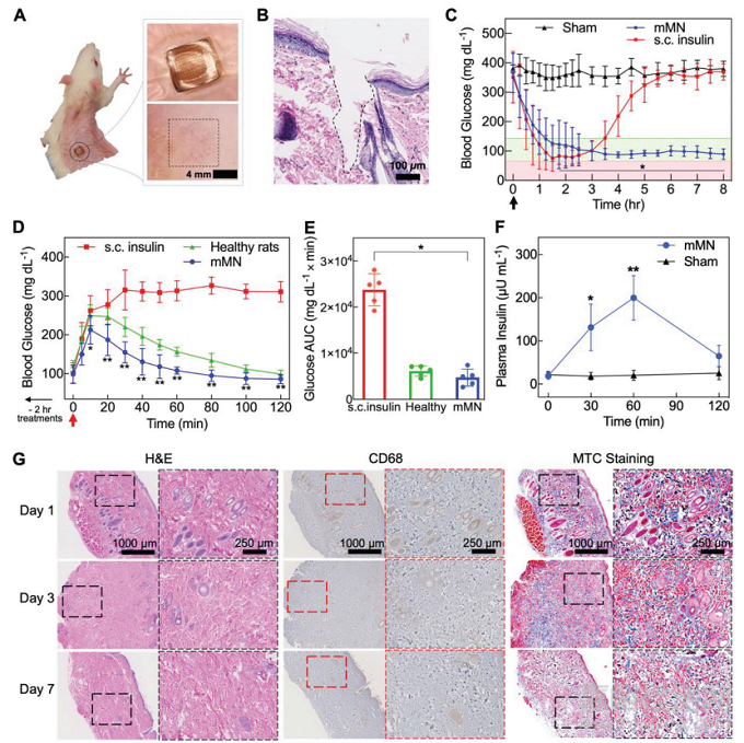 為了研究 mMN 貼片的血糖調(diào)節(jié)能力,在應(yīng)用 mMN 或注射胰島素 2 小時(shí)后,通過(guò)注射 2 g kg-1 葡萄糖進(jìn)行腹腔內(nèi)葡萄糖耐量試驗(yàn)(IPGTT),以將初始血漿葡萄糖水平降至類似正常血糖水平。如圖 5D 所示,經(jīng) mMN 治療的 T1D 大鼠在血糖水平達(dá)到峰值后,其血糖濃度恢復(fù)到與健康大鼠相似的正常血糖水平。相反,皮下注射(s.c.)胰島素 2 小時(shí)后的 T1D 大鼠在葡萄糖挑戰(zhàn)后出現(xiàn)了持續(xù)的高血糖。經(jīng) s.c. 胰島素處理的大鼠的葡萄糖曲線下面積(AUC)是經(jīng) mMN 貼片處理的大鼠 120 分鐘持續(xù)葡萄糖暴露量的五倍(圖 5E)。mMN 貼片的葡萄糖調(diào)節(jié)作用可歸因于其葡萄糖依賴性胰島素釋放。如圖 5F 所示,在 t = 0 時(shí)(即 mMN 貼敷 2 小時(shí)后),當(dāng)血糖水平恢復(fù)到優(yōu)格血癥時(shí),mMN 貼片處理大鼠的血漿胰島素與假貼片處理組一樣處于低水平,表明此時(shí)胰島素 mMN 貼片釋放的胰島素檢測(cè)不到。在 t = 0 時(shí)進(jìn)行葡萄糖挑戰(zhàn)后,血漿胰島素水平在 30 分鐘和 60 分鐘時(shí)急劇升高達(dá) 9.8 倍,然后在 120 分鐘時(shí)再次降至基礎(chǔ)水平,而假貼片處理大鼠的血漿胰島素水平?jīng)]有變化(圖 5F)。這些結(jié)果表明,mMN貼片能夠根據(jù)血糖水平調(diào)節(jié)胰島素釋放速率,從而長(zhǎng)時(shí)間維持正常血糖,而不引起低血糖,并迅速抑制高血糖。由于 T1D 大鼠的禁食時(shí)間和持續(xù)研究中每只大鼠的血樣數(shù)量有限,胰島素 mMN 貼片的長(zhǎng)期療效將通過(guò)大型動(dòng)物模型進(jìn)行評(píng)估,本研究小組正在進(jìn)行后續(xù)的研究。