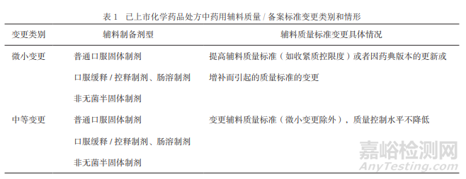 案登記的藥用輔料發(fā)生變更時輔料登記人應主動開展研究,并及時通知相關藥品制劑生產企業(yè)/持有人,及時更新登記資料,并在年報中體現。持有人在接到上述通知后應及時按照相關規(guī)定,參照相關技術指導原則,全面評估、驗證變更事項對藥品安全性、有效性和質量可控性的影響,進行相應的研究工作,并依據現行藥品注冊管理規(guī)定向相應部門提出補充申請、備案或報告。藥用輔料質量標準相關的變更法規(guī)和技術指導原則有《藥品上市后變更管理辦法》(2021年)、《已上市中藥藥學變更研究技術指導原則》(2021年)、《已上市生物制品藥學變更研究技術指導原則》(2021年)和《已上市化學藥品藥學變更研究技術指導原則》(2021年)等,其中《已上市化學藥品藥學變更研究技術指導原則》[19]的第四部分“變更制劑處方中的輔料”,對輔料質量標準變更按變更類別和制備的劑型進行分類(見表1)。