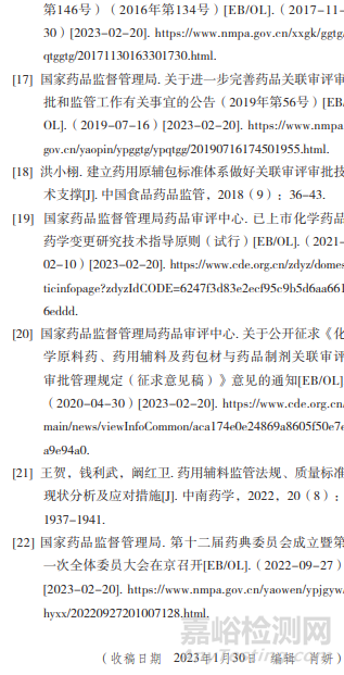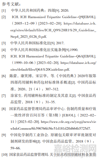 《中華人民共和國藥品管理法》(2019年修訂)第二十八條明確規(guī)定:國務院藥品監(jiān)督管理部門頒布的《中華人民共和國藥典》(簡稱《中國藥典》)和藥品標準為國家藥品標準。我國將藥用輔料標準納入藥品標準管理?!吨袊幍洹肥蛰d的藥用輔料標準是我國藥用輔料的藥典標準,包括品種正文及其引用的凡例、通用技術要求(包括通則、指導原則等),具有法定性和權威性。藥典輔料標準正文的起草是基于國內已有藥用輔料的使用情況、供應現狀或生產水平而制訂的。藥用輔料藥典標準是對藥用輔料質量控制的基本標準,宣稱符合《中國藥典》的藥用輔料必須符合《中國藥典》凡例、通則、品種各論等規(guī)定。作為《中國藥典》的重要組成部分之一的藥用輔料標準已經成為藥用輔料生產、選用、審評審批及監(jiān)管的重要依據[6]。除《中國藥典》外,國外發(fā)達國家和地區(qū)頒布的藥典,如美國藥典(United States of Pharmacopoeia,USP)、歐洲藥典(European Pharmacopoeia,EP)、英國藥典(British Pharmacopoeia,BP)、日本藥典(Japanese Pharmacopoeia,JP)等,也具有重要參考意義。