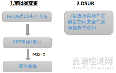 與上市后藥品變更不同,對于臨床試驗期間的藥學變更,CDE把評估權(quán)更多的交給了申請人。只有影響受試者安全性的重大變更要向CDE提交補充申請,如果臨床期間的藥學變更屬于未影響受試者安全性的一般變更,申請人可以直接實施并在DSUR報告中說明,見圖1。