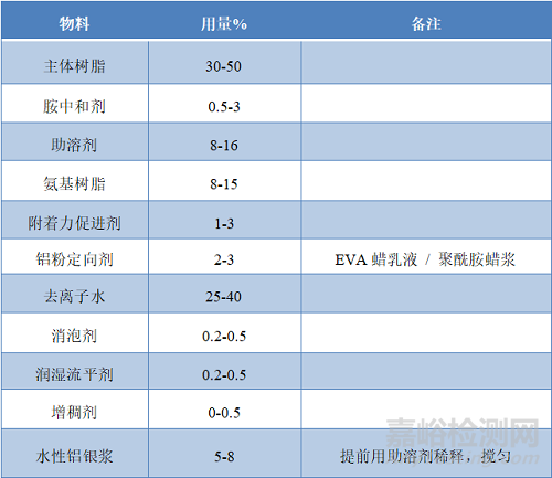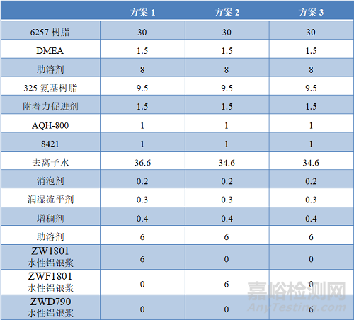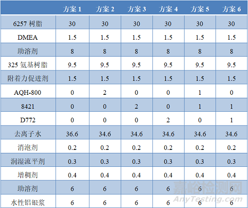 實驗中選用的主體樹脂為江門 6257水性丙烯酸樹脂、華科821水性聚酯樹脂、萬華化學(xué)的2057羥基丙烯酸分散體和雙鍵化學(xué)的DB3642羥基丙烯酸分散體中的一種或幾種。氨基樹脂選用湛新的325 、327、303和三木的5717W氨基樹脂。鋁銀漿選用旭陽和族興的水性鋁銀漿,包括鈍化型水性鋁銀漿和包膜型水性鋁銀漿。鋁粉定向劑選用BYK的AQUATIX 8421、帝斯巴隆的AQH-800、核心化學(xué)的D772。其他助劑及助溶劑選用市面上常用的流通產(chǎn)品。