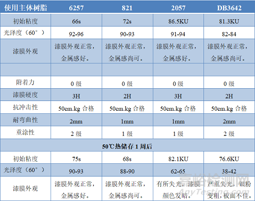 氨基樹脂分別選用湛新的325 、327、303和三木的5717W氨基樹脂,氨基比均采用2.7:1。主體樹脂均使用6257樹脂;鋁粉定向劑AQUATIX 8421、AQH-800各添加1%;水性鋁銀漿均使用族興的二氧化硅包覆型水性鋁銀漿(平均粒徑17μm);烘烤條件:160℃/20min;測試結(jié)果見表3所示。
