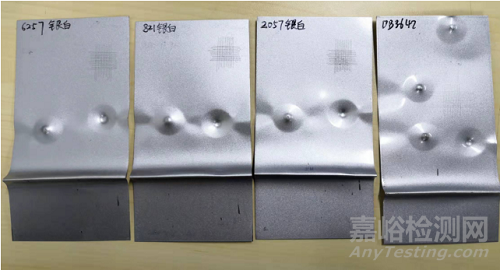由表2可知,6257和2057初始漆膜金屬感最好,這兩款樹脂銀粉排列效果好。821和DB3642的銀粉排列效果尚可,板面正常,沒有發(fā)花等弊病,但銀排效果比前者略差。機(jī)械性能各組都差不多,但6257和DB3642的耐彎曲性略差,重涂性也略差,821聚酯的耐彎曲性較好。儲存穩(wěn)定性6257和821較好,熱儲存后漆膜光澤度下降幅度不明顯;但2057和DB3642的儲存穩(wěn)定性較差,漆膜光澤度下降,其中DB3642最差,銀粉出現(xiàn)反粗;可知水溶型樹脂做銀粉漆的儲存穩(wěn)定性較好,羥基丙烯酸分散體做銀粉漆儲存穩(wěn)定性不佳,但是由于水溶型樹脂中含有機(jī)溶劑,成品漆的VOC含量比用分散體的高。圖1為性能測試照片。