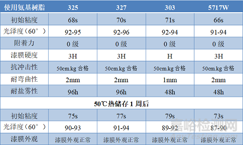 由表3可知,使用不同氨基樹脂,對漆膜的外觀、光澤度、附著力無明顯影響,對漆膜硬度、柔韌性有影響。其中303氨基樹脂為六甲氧基甲基三聚氰胺樹脂,產(chǎn)品高度烷基化,與主體樹脂發(fā)生交聯(lián)反應(yīng)所需的溫度更高;其余幾款為部分甲醚化的高亞氨基三聚氰胺甲醛樹脂,其分子中含有羥甲基,反應(yīng)性更強,所需烘烤溫度相對較低。使用303氨基樹脂的漆膜柔韌性更好,漆膜硬度稍低;使用其他幾款氨基樹脂的漆膜則硬度較高。使用325、327氨基樹脂的漆膜耐鹽霧性比使用303、5717W的更好。