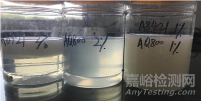 下圖2是添加不同鋁粉定向劑的基礎(chǔ)漆熱儲2周后的照片。左邊的是只加2%的8421的基礎(chǔ)漆;熱儲后8421漂浮在基礎(chǔ)漆上部。中間的是只加了2%的AQH-800的基礎(chǔ)漆;熱儲后AQH-800均勻的分布在基礎(chǔ)漆里。右邊的是8421與AQH-800各加了1%;熱儲后也能均勻分布其中。