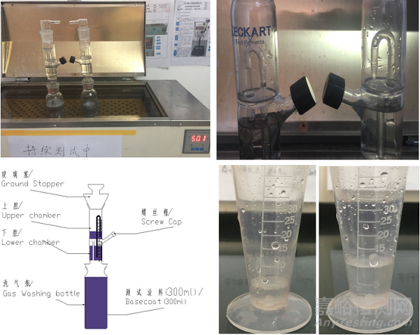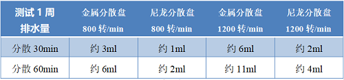 鋁可以和水發(fā)生反應(yīng),采用二氧化硅包膜可以阻止鋁粉與水的反應(yīng)。但鋁銀漿自身的二氧化硅保護(hù)膜通常很薄;生產(chǎn)過程中分散盤過大的剪切力可能會對保護(hù)膜造成破壞,致使裸露的鋁粉在堿性條件下與水反應(yīng)產(chǎn)生氫氣。為驗證分散盤和轉(zhuǎn)速對鋁粉的影響,分別使用帶齒金屬分散盤和圓盤狀的尼龍分散盤,轉(zhuǎn)速分別采用800r/min和1200r/min。分散的時間分別采用30min、60min。涂料做好后,采用下圖的裝置進(jìn)行測試。分別取300ml涂料放在容器中,保持50℃熱儲,持續(xù)進(jìn)行1周。涂料熱儲過程中,包膜受到破壞的鋁粉與水反應(yīng)產(chǎn)生氫氣,導(dǎo)致瓶中氣壓增大,使下腔的水被擠壓到上腔。測量上腔的排水量即表示產(chǎn)生氫氣的量;排水量越大,表示鋁粉包膜被破壞的越嚴(yán)重。